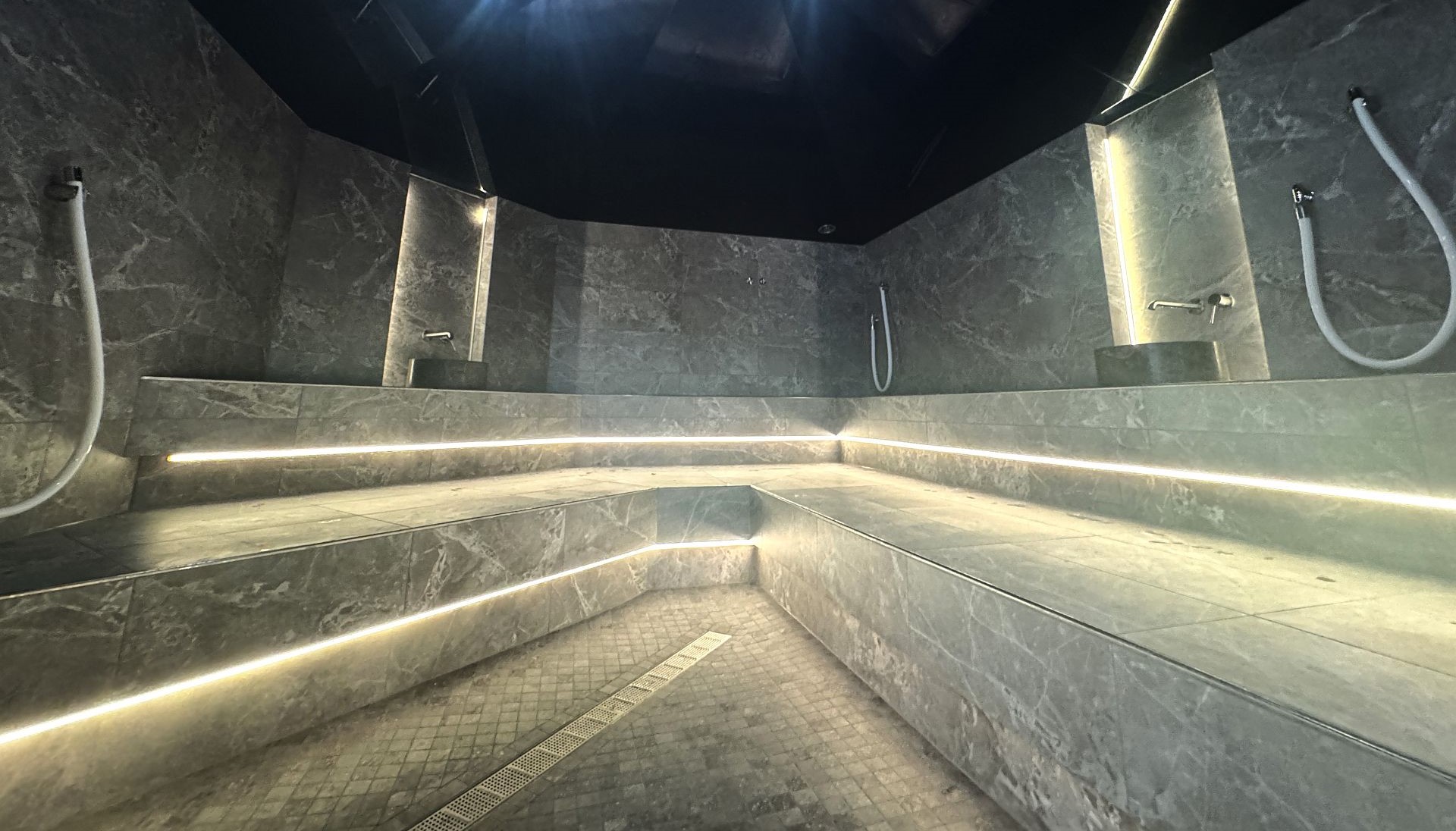Treten Sie ein, hier erwartet Sie Dampf in seiner schönsten Form. Die ideale Kombination von Wärme und Feuchtigkeit pflegt, reinigt, entkrampft und entspannt: Ein warmer Wassernebel legt sich auf Ihre Haut, Sie hören sanfte Klänge und wechselndes Farblicht sorgt für ein stimmungsvolles Bild. Im zweistufigen Dampfbad haben Sie die Wahl zwischen der heißeren oder kühleren Temperaturzone. Durch die gerade Stufenform ist auch der Genuss im Liegen möglich oder das Hochlegen der Beine. Die eingearbeiteten beleuchteten Steintröge ermöglichen das Händewasche nach dem Peeling und eignen sich auch bestens für eine Erfrischung zwischendurch.